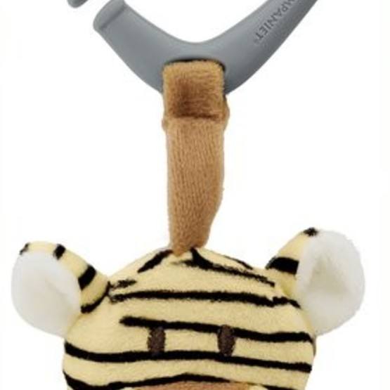 Diinglisar bitleksak och vagnhänge har tre olika funktioner. Den söta tigern är dekorativ som vagnhänge, en interaktiv leksak då figuren har prassel inuti sig och den är även en bitring då det grå hjärtat har små piggar som hjälper barnet när det kliar i munnen.